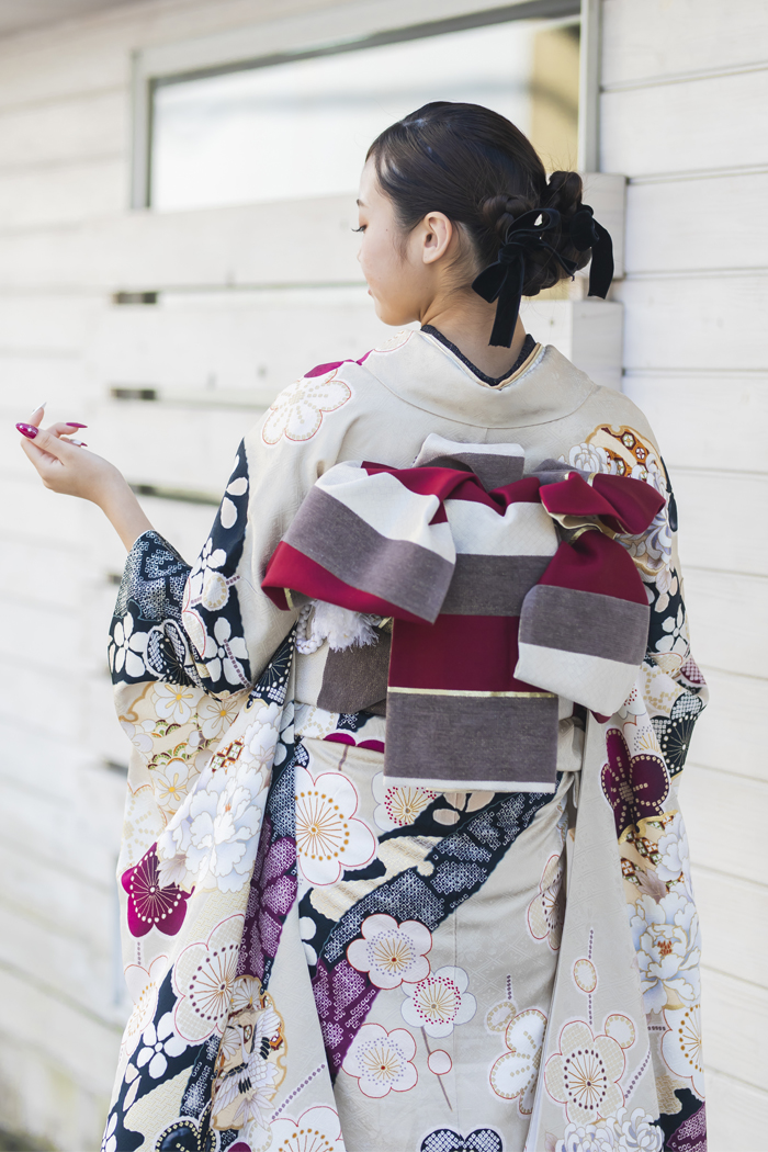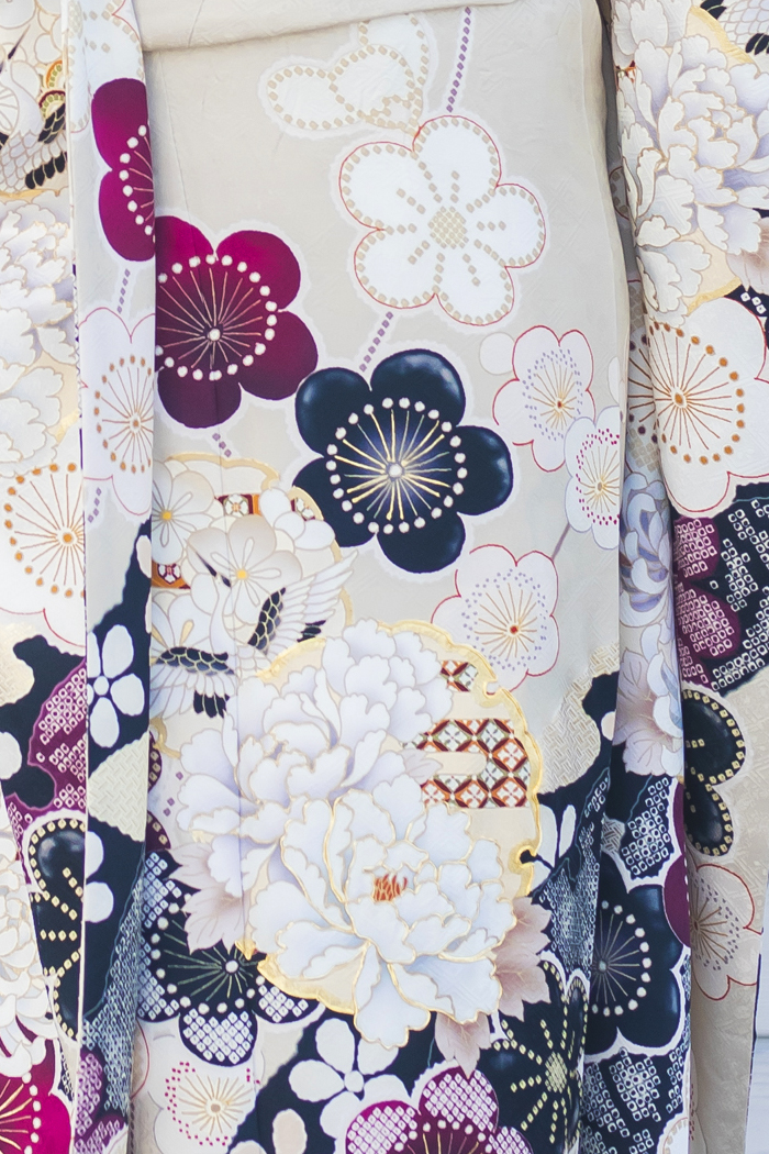 やわらかベージュに咲く花々|甘さを抑えた大人レトロ振袖【RE639】 レトロ古典 やわらかベージュに咲く花々|甘さを抑えた大人レトロ振袖【RE639】 ベージュ系 やわらかなベージュ地に、多彩な花意匠を重ねた奥行きのあるレトロ振袖。落ち着いた色調の中に、紫や黒が効いた大人びた表情が魅力です。柄の配置にリズムがあり、動くたびに美しい流れを描きます。甘さを抑えた配色が、洗練されたレトロ感を演出。品の良さと個性を両立した、印象深い一着です。