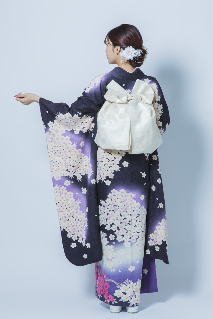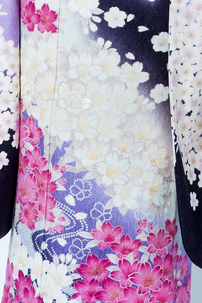 深い紫に浮かぶ満開の桜|幻想的で気品漂う古典振袖【RE488】 古 典 深い紫に浮かぶ満開の桜|幻想的で気品漂う古典振袖【RE488】 紫系 深みのある紫から藤色へと移ろうグラデーションが美しい一着。満開の桜が全体に広がり、優雅で幻想的な雰囲気を演出します。裾元に咲く鮮やかな花々が、華やかさと気品をプラス。古典の美しさに、現代的な洗練を感じさせるデザインです。成人式や前撮りで、凛とした存在感を放つ振袖です。