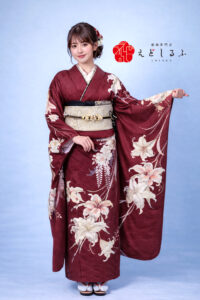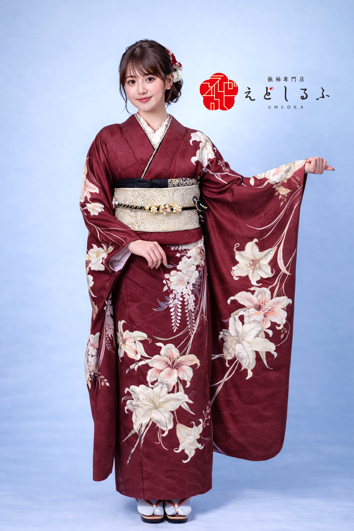 深みワインレッドに咲く大輪百合|上品な華やかさが際立つ大人レトロ振袖【RE794】 レトロ古典 深みワインレッドに咲く大輪百合|上品な華やかさが際立つ大人レトロ振袖【RE794】 赤系 深みのあるワインレッド地に、大輪の百合が大胆に描かれた一枚。白を基調とした花々が浮き立ち、上品な華やかさを演出します。帯はゴールド×黒でメリハリをつけ、ぐっと大人っぽい印象に。凛とした表情を引き立てるシンプルな柄ゆきで、写真映えも抜群です。