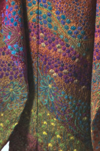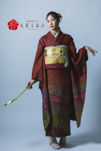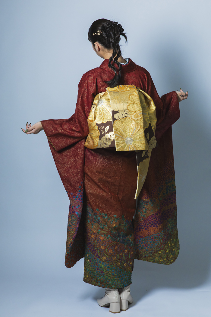 深紅に浮かぶ朧染の花|質感で魅せるクラシカルモード振袖【RE451】 ヴィンテージ 深紅に浮かぶ朧染の花|質感で魅せるクラシカルモード振袖【RE451】 赤系 深みのある赤に、細やかな朧染の花模様が広がる一着。光の当たり方で質感が浮かび上がり、ため息が出るほどの美しさ。ゴールドの帯で華やぎをプラスし、クラシカルな重厚感も備えています。和の伝統を感じさせながらもモード感ある着こなしが可能で、レトロなヘアスタイルや、現代的なブーツ合わせも似合います。