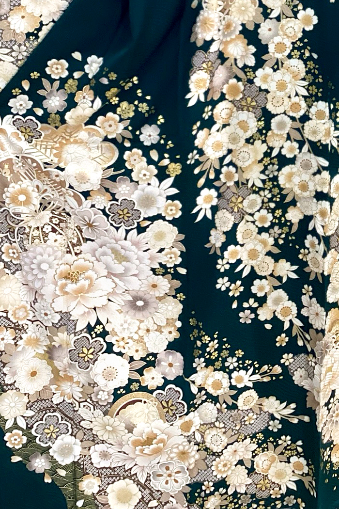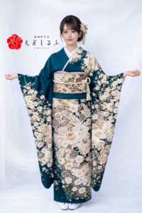 深緑に咲く白椿と菊|格式と華やかさが調和する気品ある華古典振袖【RE792】 古 典 深緑に咲く白椿と菊|格式と華やかさが調和する気品ある華古典振袖【RE792】 緑系 深みのあるグリーンに咲き誇る白椿と菊。金彩と繊細な柄が織りなす、気品あふれる一枚です。淡いベージュの帯で抜け感を加え、洗練された古典美を演出。花々の配置が美しく流れ、身にまとうだけで所作まで優雅に映えます。控えめな色数ながら、格式と華やかさの絶妙なバランスが魅力です。