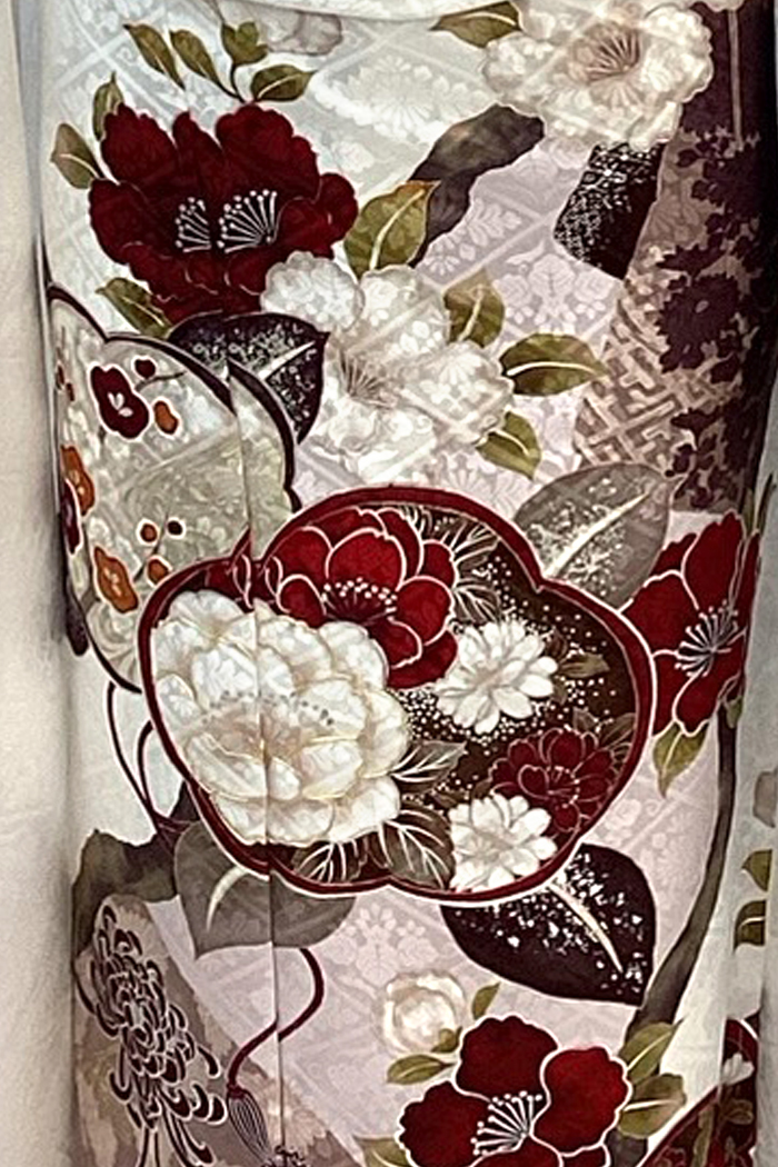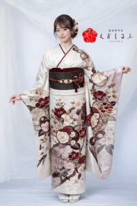 生成り×ふんわりピンクに舞う花々|品格と華やぎを備えた華古典振袖【RE774】 古 典 生成り×ふんわりピンクに舞う花々|品格と華やぎを備えた華古典振袖【RE774】 白系 やわらかなピンクのグラデーションが入った生成り地に、深みのある赤を効かせた草花文様が華やかに描かれた一着。牡丹・椿・桜など、季節を彩る花々がバランスよく配置され、上品で格式ある佇まいに仕上がっています。シンプルながら高級感のある帯と、小物の赤がアクセントとなり、引き締まった印象もプラス。落ち着いたトーンの中に、ハレの日らしい華やぎを演出できる華古典振袖スタイルです。