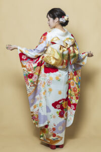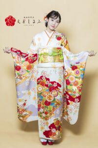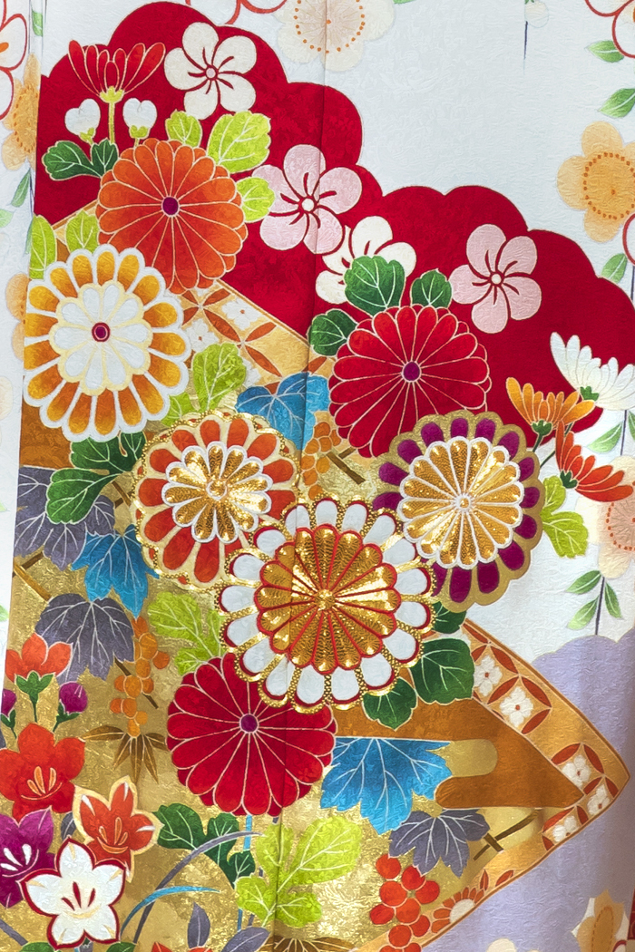 白地に咲く色鮮やかな花々|格式と華やぎを纏う王道古典振袖【RE534】 古 典 白地に咲く色鮮やかな花々|格式と華やぎを纏う王道古典振袖【RE534】 白系赤系 清楚な白地に、色鮮やかな花々が咲き誇る華やかな一着。赤や橙、緑の配色が美しく、晴れの日にふさわしい存在感を演出します。扇面に広がる古典柄が、上品さと格式を感じさせるデザイン。可憐さと気品を兼ね備えた、王道の古典振袖です。成人式や前撮りで、明るく優雅な印象を叶えます。