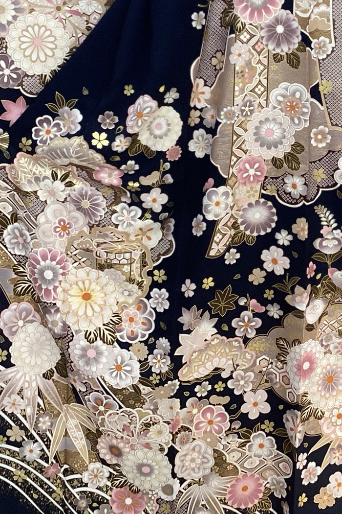 紺地に咲く金彩と四季の花々|清楚で華やかな王道古典振袖【RE802】 古 典 紺地に咲く金彩と四季の花々|清楚で華やかな王道古典振袖【RE802】 青系 品ある紺地に、金彩と淡色の花々が咲き誇る王道の古典振袖。牡丹や菊、桜など四季の花が重なり合い、晴れの日にふさわしい格式の高さを演出。繊細な柄ゆきは、まるでレースのような優美さを感じさせるデザインです。淡いピンクの帯と小物でやわらかさをプラスし、大人っぽさと可憐さが両立。清楚で華やかな一着をお探しの方に、自信をもっておすすめです。