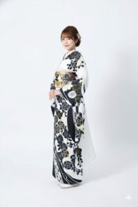 RE457 クール RE457 白系黒系 モノトーンをベースに、黒とゴールドの花々が力強く描かれた振袖。白地のすっきりとした余白に、緻密な花模様が際立ち、シックでエレガントな雰囲気を醸し出しています。ゴールドのアクセントが加わることで、上品さと華やかさが絶妙なバランスに。洗練された都会的なスタイルを好む方にぴったりな一着です。 フルセットレンタル 250,000円(税込) ※掲載コーディネートの袋帯・その他小物は非売品を含むオプション品(要別途料金)を使用しています。