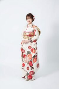 RE359 レトロ古典 RE359 白系 あたたかみのあるクリーム地に、紅白の梅がふんわりと咲き誇るレトロ古典の振袖。丸みのある愛らしい柄とやさしい色合いが、上品でどこか懐かしい雰囲気を演出します。落ち着きと華やかさを併せ持つ、王道レトロスタイルの一枚です。 フルセットレンタル 280,000円(税込) ※掲載コーディネートの袋帯・その他小物は非売品を含むオプション品(要別途料金)を使用しています。