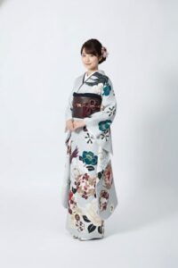 RE535 レトロ古典 RE535 白系青系 上品なグレージュ地に、深みのある紫や濃い青の花々が描かれた、洗練された雰囲気の振袖。落ち着いた色調ながらも大胆な柄づかいがモダンで、大人っぽい個性を引き立てます。クラシックとスタイリッシュが調和した、センス際立つ一枚です。 フルセットレンタル 250,000円(税込) ※掲載コーディネートの袋帯・その他小物は非売品を含むオプション品(要別途料金)を使用しています。