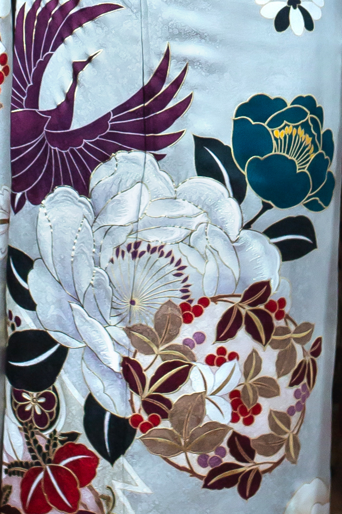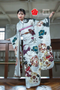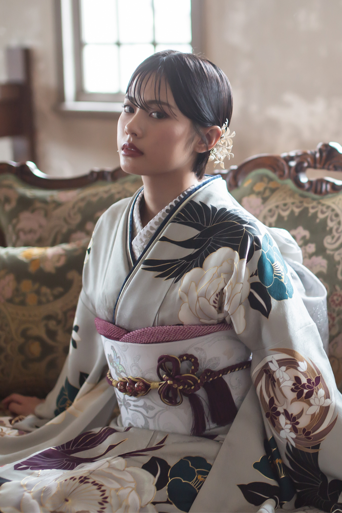 銀鼠色に舞う花と鶴|都会的で芯の強さを感じるモダン振袖【RE535】 クール 銀鼠色に舞う花と鶴|都会的で芯の強さを感じるモダン振袖【RE535】 白系黒系 艶やかな銀鼠色の地に、大胆な花々と鶴が舞うモダンな振袖。落ち着いたトーンでまとめた色使いが、洗練された大人の雰囲気を引き立てます。白・黒・紫・深緑など、クールな配色が美しく調和し、都会的で芯の強さを感じるスタイルに。シンプルながらも存在感のある柄行きで、印象に残る特別な一着です。