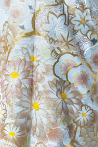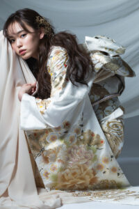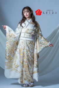 白地に広がる松・梅・菊の金彩古典柄|凛とした美しさを纏う振袖【RE568】 クール 白地に広がる松・梅・菊の金彩古典柄|凛とした美しさを纏う振袖【RE568】 白系 澄んだ白地に、繊細な金彩と淡い色使いで描かれた松や梅、菊などの古典柄が上品に広がる一枚。流れるような柄行きと、柔らかくきらめく金の光沢が、静かな存在感と気品を引き立てます。クールで洗練された雰囲気のなかに、ふんわりとした女性らしさも漂うデザインが魅力。大人っぽくも、自分らしく凛とした着こなしを楽しみたい方におすすめの振袖です。