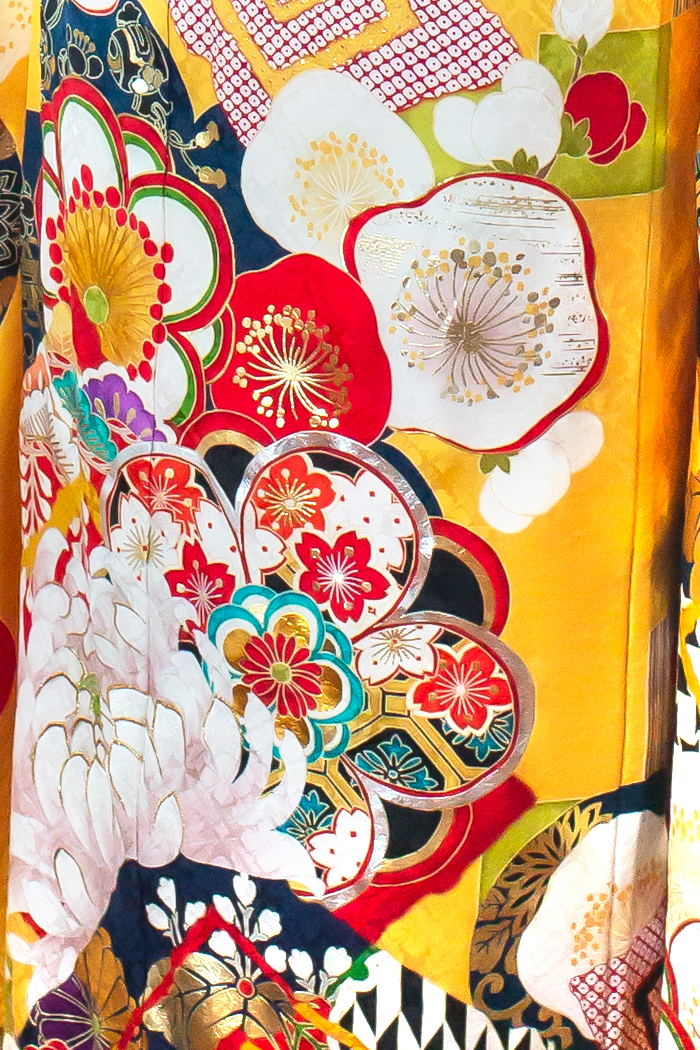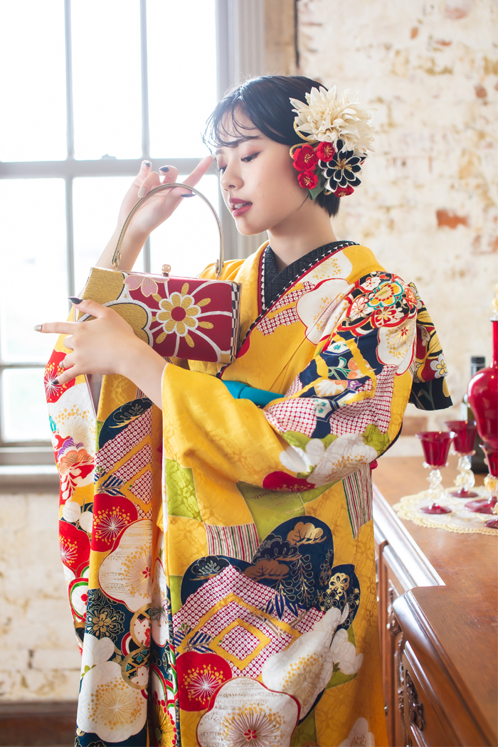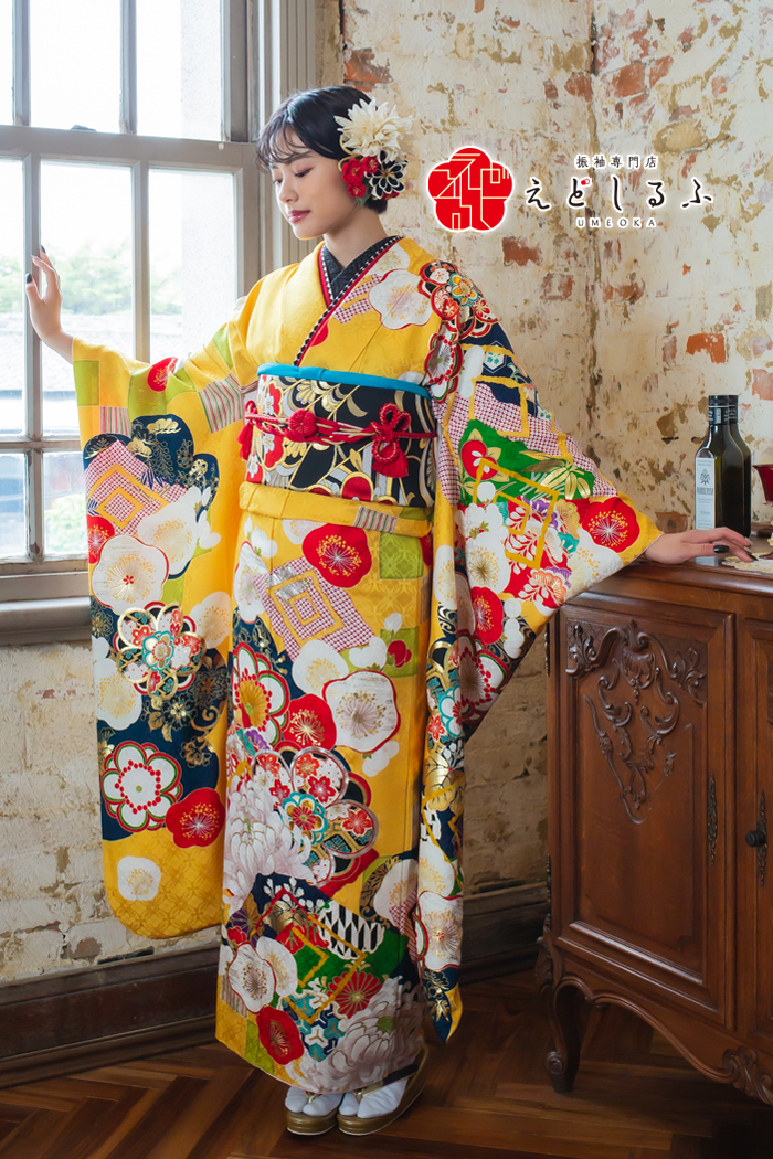 イエローに舞う極彩色の花|古典をモダンカラーで楽しむレトロ古典振袖【RE454】