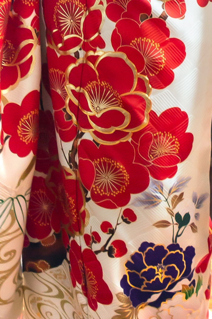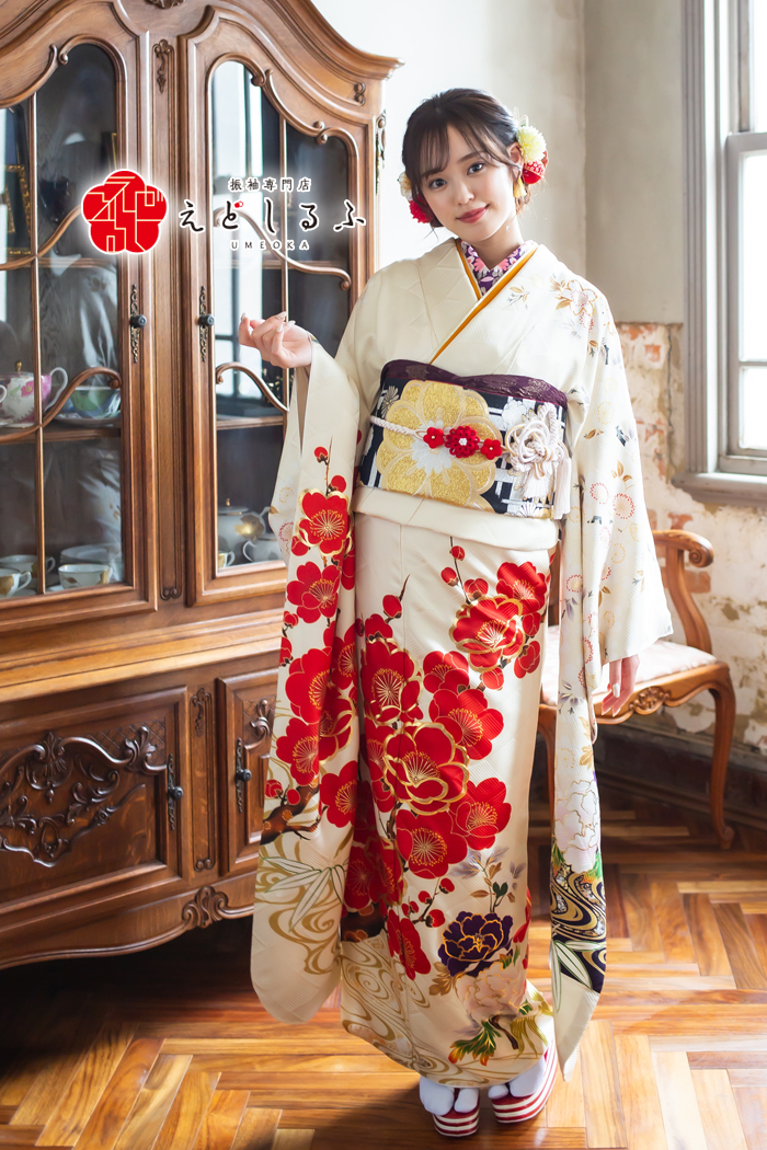 オフホワイトに映える赤の大輪梅|可愛さ×華やかさのレトロ古典振袖【RE537】 レトロ古典 オフホワイトに映える赤の大輪梅|可愛さ×華やかさのレトロ古典振袖【RE537】 白系 オフホワイト地に、鮮やかな赤色の大きな梅柄が目を引く振袖です。ふっくらとした花びらや、繊細な枝ぶりが丁寧に描かれています。裾にかけては、紫や金色のアクセントが加わり、華やかさを一層引き立てています。古典的な梅柄でありながら、全体の色使いや柄の配置がモダンな印象を与えるため、レトロ古典柄がお好きな方はもちろん、可愛い柄がお好きな方にもぴったりな一枚です。