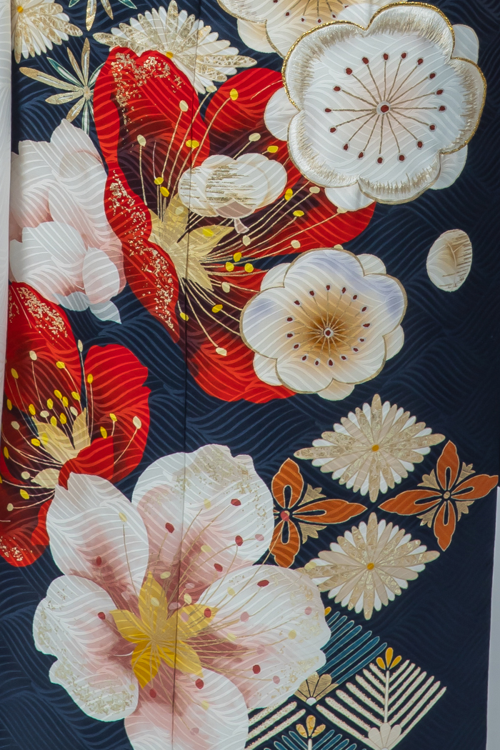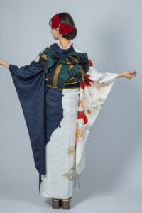 RE727 レトロ古典 RE727 青系 深みのあるネイビーに、赤と白の椿が咲く華やかレトロ振袖。差し色のグリーン帯と真っ赤な髪飾りが映える、アンティークな世界観が好きな方に。 フルセットレンタル 280,000円(税込) ※掲載コーディネートの袋帯・その他小物は非売品を含むオプション品(要別途料金)を使用しています。