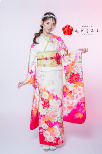 白地に咲くピンク花グラデーション|可憐で華やかな振袖【RE216】 レトロ古典 白地に咲くピンク花グラデーション|可憐で華やかな振袖【RE216】 ピンク白系 白地をベースに、明るいピンクからオレンジへのグラデーションが美しく広がる振袖。 牡丹や桜、紅葉など四季折々の花々が華やかに描かれ、まるで花園に包まれているような可憐で明るい印象を演出します。全体の色彩バランスが柔らかく、女性らしい上品さと華やかさを併せ持った一着です。