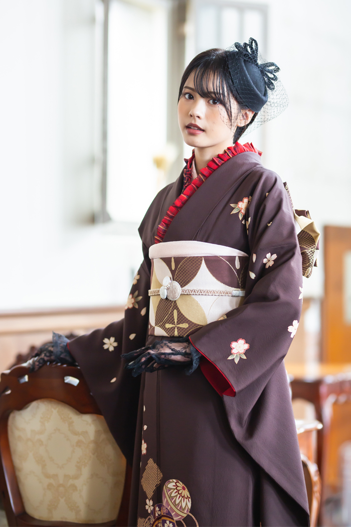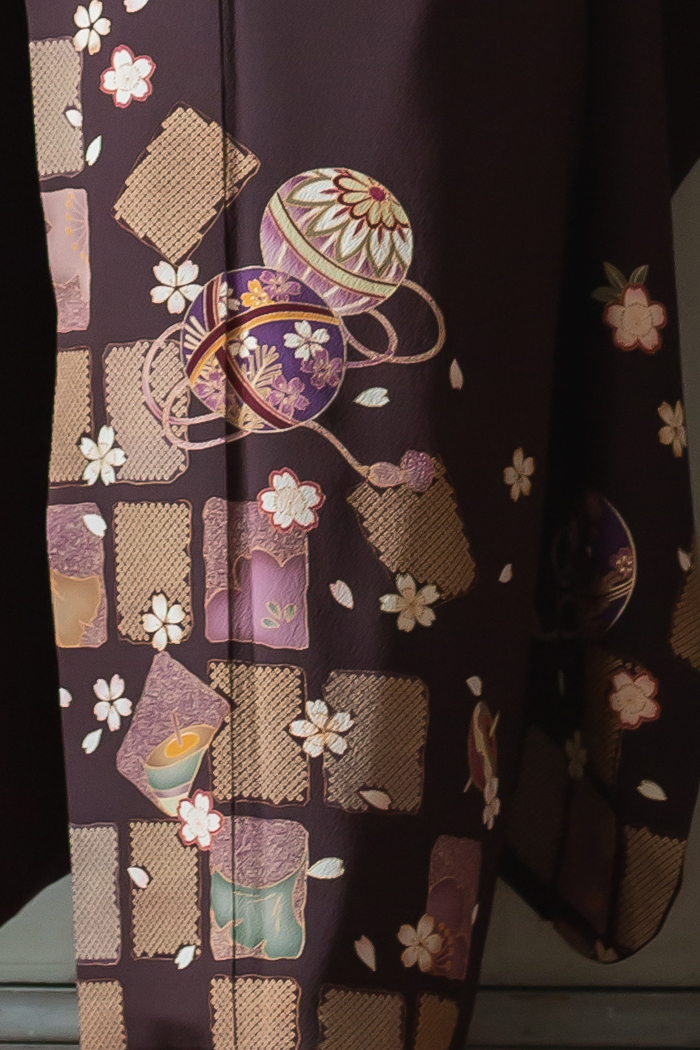 ブラウン地に踊る手毬と桜|金彩が輝く伝統×モダンのレトロ古典振袖【RE245】 レトロ古典 ブラウン地に踊る手毬と桜|金彩が輝く伝統×モダンのレトロ古典振袖【RE245】 黒系 落ち着いたブラウン地に、桜や手毬の古典柄が現代的な感性で描かれた洗練の振袖。金彩の上品な輝きと、襟元や袖口に覗く赤が華やかなアクセントに。 伝統とモダンをバランスよく取り入れた一枚です。