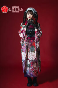 ワインレッド×紫のゴシック花柄|個性が際立つ重厚な振袖【RE394】 ゴシック ワインレッド×紫のゴシック花柄|個性が際立つ重厚な振袖【RE394】 紫系赤系 ワインレッドから濃紫へのグラデーションに、華やかな牡丹や薔薇が咲き誇る、ゴシックなムードの振袖。白や黒、くすみカラーの花々が重厚感を生み出しつつ、ラメや金彩の煌めきが随所に散りばめられ、まるで一枚の絵画のような存在感を放ちます。帯はマットな黒地にレースやリボンをあしらい、甘さと辛さの絶妙なバランスを演出。メイド風カチューシャやレース手袋を合わせれば、ハタチだからこそ楽しめるゴシック×和の世界観に。個性を存分に発揮したい方におすすめの一着です。