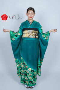 エメラルドグリーンに映える椿|洗練された個性が光るヴィンテージ振袖【RE438】 クール エメラルドグリーンに映える椿|洗練された個性が光るヴィンテージ振袖【RE438】 緑系 深みのあるエメラルドグリーンに、螺鈿細工のような椿が大胆に配置された大人可愛い振袖。立体感のある染めで光を受け艶やかに輝く生地は、上品さと存在感を兼ね備えた特別な一着です。クールで洗練された印象の中に、花柄の優しさが程よく調和しています。人と被らないカラーで、個性を大切にしたいあなたにぴったり。