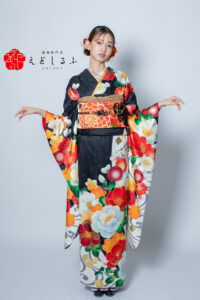 艶黒に映える梅・菊・椿の色彩|上品さと今っぽさが調和した古典振袖【RE442】 レトロ古典 艶黒に映える梅・菊・椿の色彩|上品さと今っぽさが調和した古典振袖【RE442】 黒系 文様が入った艶のある黒地に、くすみ赤や生成りを取り入れた絶妙な配色が魅力的な一枚。大ぶりの梅や菊、椿が描かれたデザインは、古典柄の持つ格式のある美しさと、今っぽいニュアンスカラーの柔らかさを両立しています。 派手すぎず、それでいてしっかり華やか。「上品さ」と「自分らしさ」を大切にしたい方におすすめのコーディネートです。