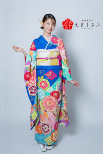 ブルーに舞い広がるパステルカラー|カラフルで写真映えするレトロ振袖【RE552】