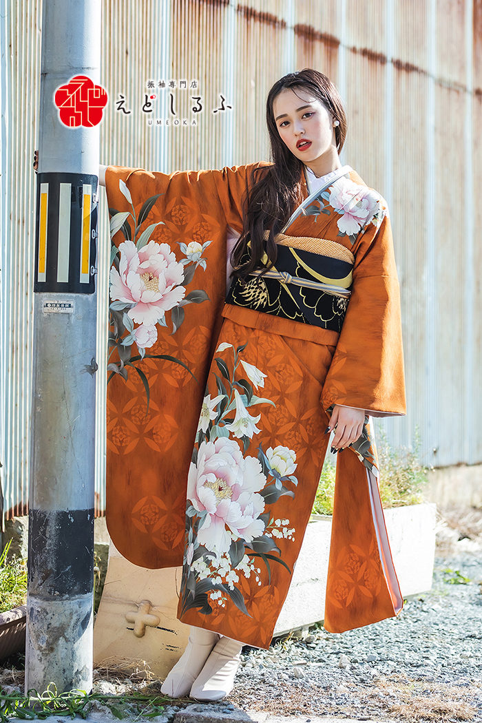 テラコッタに咲く芍薬とすずらん|人と被らない色味が魅力のヴィンテージ振袖【RE616】 ヴィンテージ テラコッタに咲く芍薬とすずらん|人と被らない色味が魅力のヴィンテージ振袖【RE616】 オレンジ系茶系 温かみのあるテラコッタカラーが目を引く、大人の個性を引き立てる一着。 大輪の芍薬とすずらんが上品に描かれ、落ち着いた色合いの中にも華やかさが漂います。 帯に黒地を選べば、柄の色を引き締めてメリハリのあるモードな印象に。 人と被らない色味でありながら、和の奥ゆかしさを感じるデザインは、周囲と差をつけたい方におすすめです。