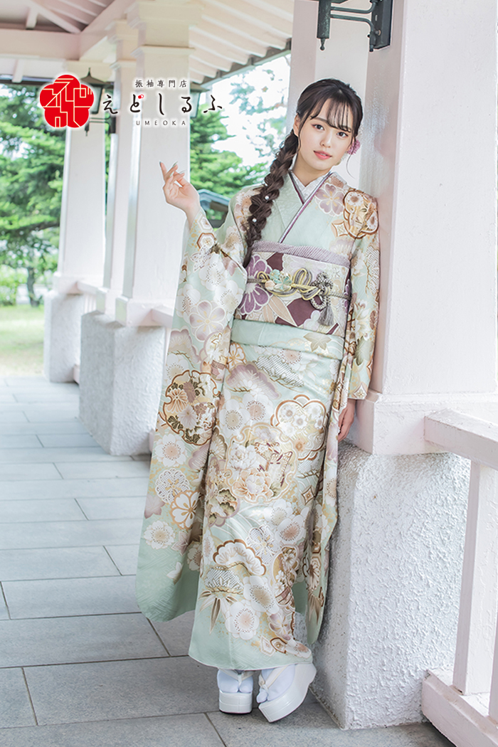 ミントグリーン×くすみピンク|可憐さと上品さを持つフェミニン華古典振袖【RE624】 フェミニン ミントグリーン×くすみピンク|可憐さと上品さを持つフェミニン華古典振袖【RE624】 緑系 やわらかなミントグリーンに、くすみピンクや淡いベージュの彩りがやさしく溶け合う一着。 繊細な柄行きの中に、古典的な意匠が上品に浮かび上がり、華やかさの中にも落ち着きを感じさせてくれます。 帯は深みのある赤紫で引き締め、全体を洗練された印象にまとめています。 可愛らしさと上品さをあわせ持つ、今どきの古典スタイルを楽しみたい方におすすめです。