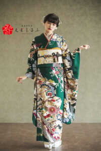 深緑に映える金赤|シックで凛とした格式ある華やか古典振袖【RE672】 古 典 深緑に映える金赤|シックで凛とした格式ある華やか古典振袖【RE672】 緑系 落ち着いた深緑の地色に、金や赤の華やかな古典文様がびっしりと描かれた一着。松竹梅や鶴、花丸文など、おめでたい意味を持つモチーフが重なり合い、格式の高さと晴れの日にふさわしい華やぎを兼ね備えています。 柄の配置は大胆ながらもバランスよく、着姿に動きと奥行きを生み出してくれるのもポイント。 重厚感のある古典スタイルが好きな方や大人っぽさと格式を両立させたい方にぴったりの、シックで凛とした雰囲気を演出しつつ、写真映えも抜群の一枚です。