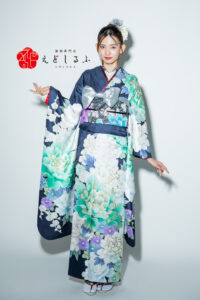 濃紺に映えるミントグリーンの大輪牡丹|華やかさと存在感を兼ね備えたクール振袖【RE683】 ギャル 濃紺に映えるミントグリーンの大輪牡丹|華やかさと存在感を兼ね備えたクール振袖【RE683】 青系 深みのある濃紺地に、大輪の牡丹が大胆に描かれた一着。グリーン・パープル・ホワイトの配色が爽やかで、落ち着きと華やかさを絶妙なバランスで兼ね備えています。 色のコントラストがはっきりしていて、写真映えはもちろん、式場でもひときわ目を引く存在感。クールなスタイルを目指す方にぴったりの振袖です。