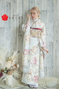 クリーム地に咲くノスタルジックな花柄|甘さと上品さが調和した振袖【RE723】 キュート クリーム地に咲くノスタルジックな花柄|甘さと上品さが調和した振袖【RE723】 ピンク白系 柔らかなクリーム地に、大きく咲き誇る花々が広がるノスタルジックな振袖。 可愛らしいピンクやベージュの色合いに、帯のボルドーが程よくアクセントを効かせて、大人っぽさも感じられる一着です。 クラシカルで上品な雰囲気がありながら、ヘアや小物で洋風のエッセンスを加えれば、自分らしいモダンなコーディネートも楽しめます。 甘さと落ち着きのバランスが絶妙で、写真映えも抜群。特別な日にふさわしい、存在感あふれる振袖です。
