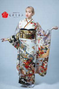 白地に映える黒赤の重厚花柄古典|凛とした和の美が際立つ振袖【RE729】 古 典 白地に映える黒赤の重厚花柄古典|凛とした和の美が際立つ振袖【RE729】 白系 白を基調にしながら黒や赤の差し色が効いた重厚感あるデザイン。 手描きのような繊細な花柄が全体に散りばめられ、まるで絵巻物のような奥行きと美しさを感じさせます。 黒の帯締めが全体をきりっと引き締め、凛とした和の美しさと華やかさが際立ちます。 モダンになりすぎず、でもありきたりじゃない。そんな“自分らしい”振袖を探している方にぴったりの一着です。