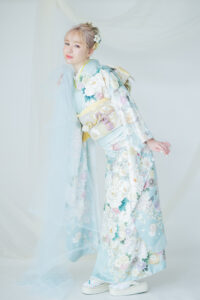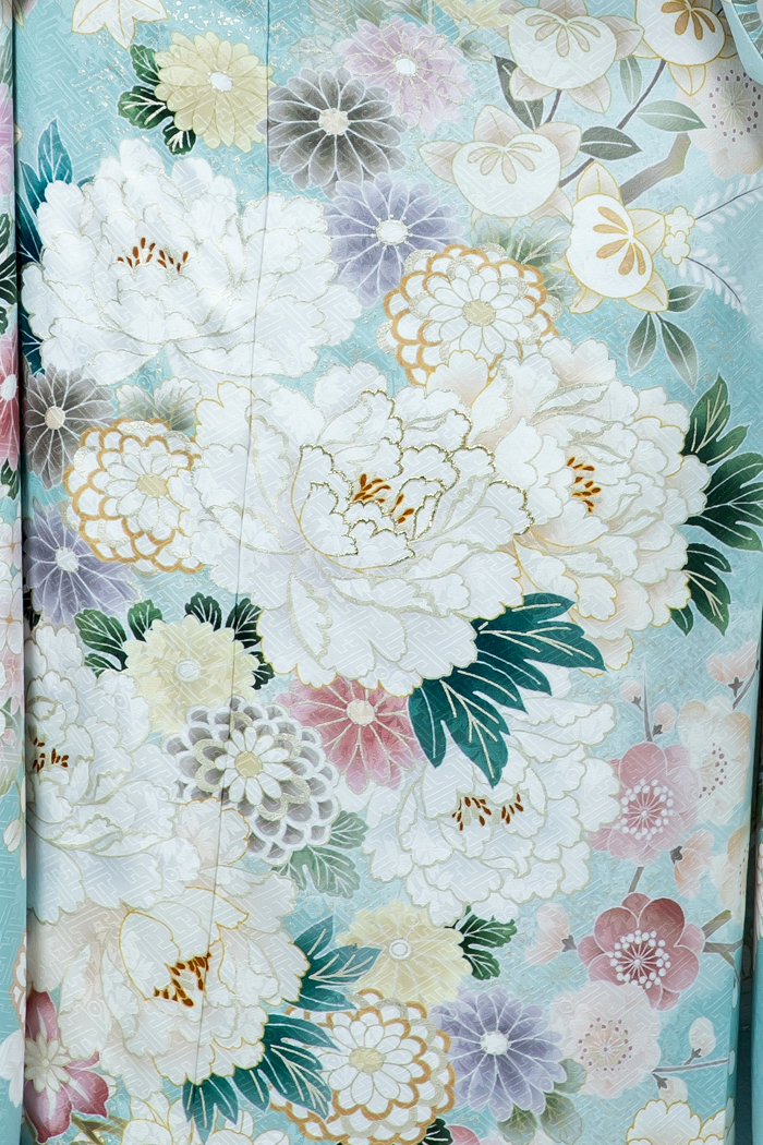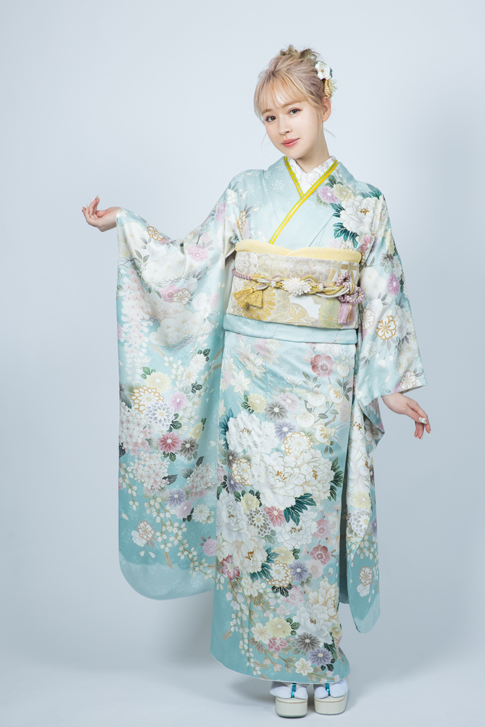 RE776 古 典 RE776 水色系 淡い水色地に大輪の白牡丹や可憐な花々が舞う、上品で清楚な振袖。 爽やかな色合いに、優しいピンクやグレーの花が重なり、柔らかい透明感を引き出しています。帯は淡いクリームに金糸を織り込み、華やかさと落ち着きを両立、やさしい統一感を持たせます。ふんわりとした雰囲気の中に、花々の存在感が際立つデザインで、凛とした可憐さを演出できる一着です。 フルセットレンタル 280,000円(税込) ※掲載コーディネートの袋帯・その他小物は非売品を含むオプション品(要別途料金)を使用しています。
